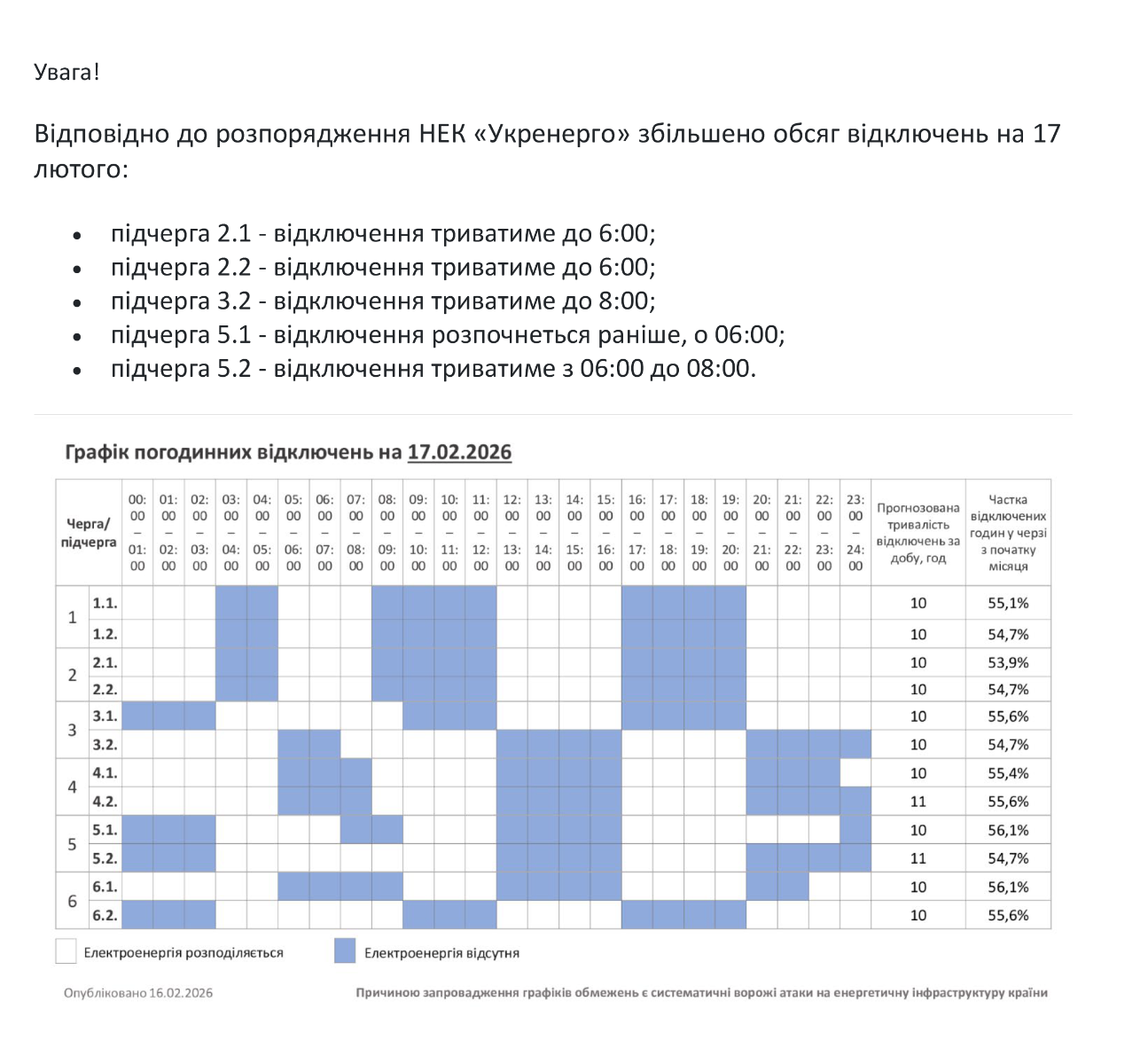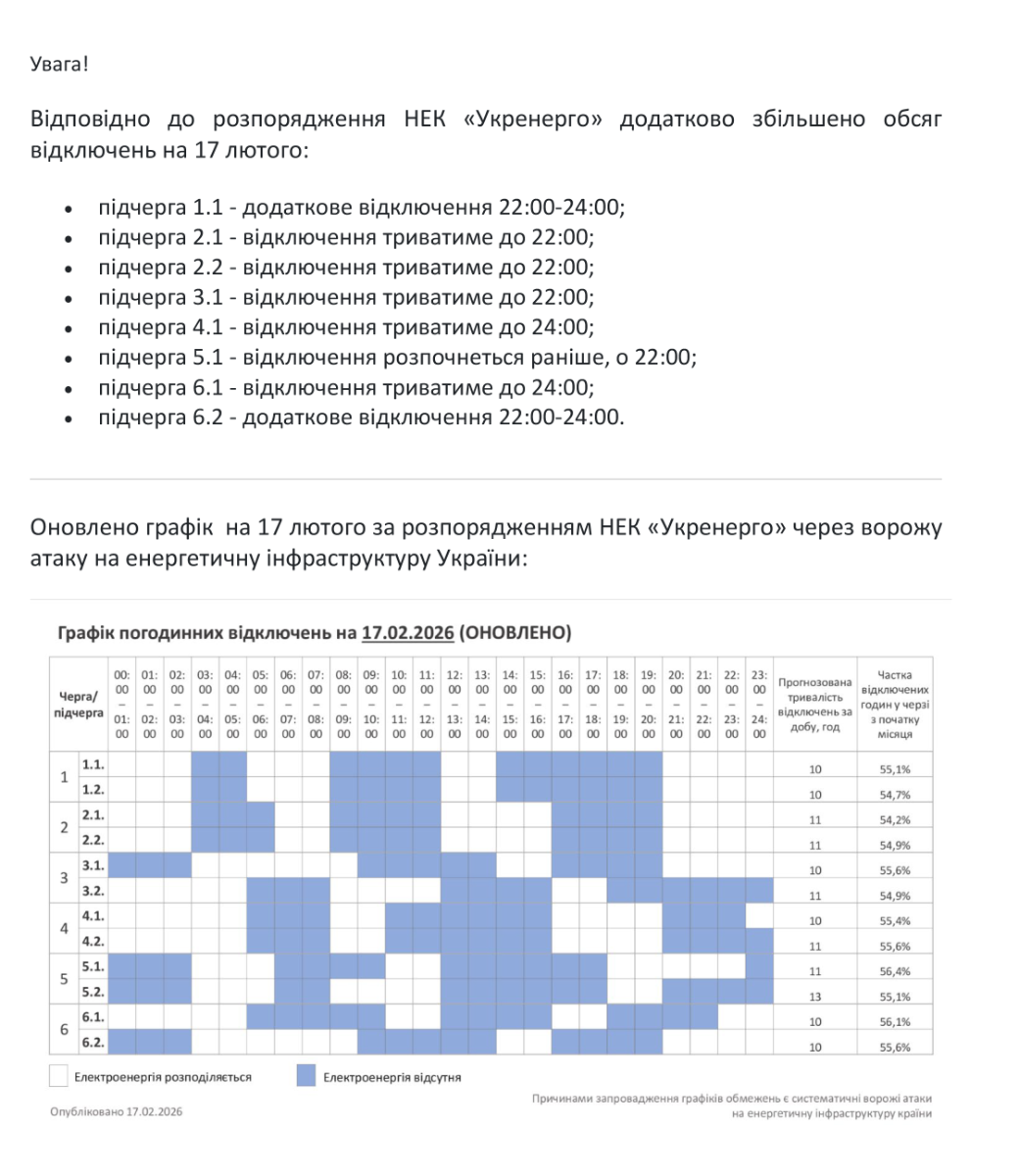 - Графік погодинних відключень 17.02.2026 (оновлення)