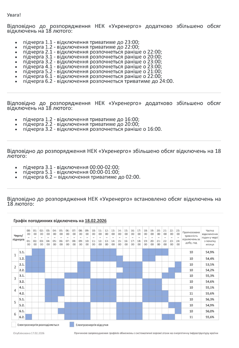 - Графік погодинних відключень 18.02.2026 (оновлення)