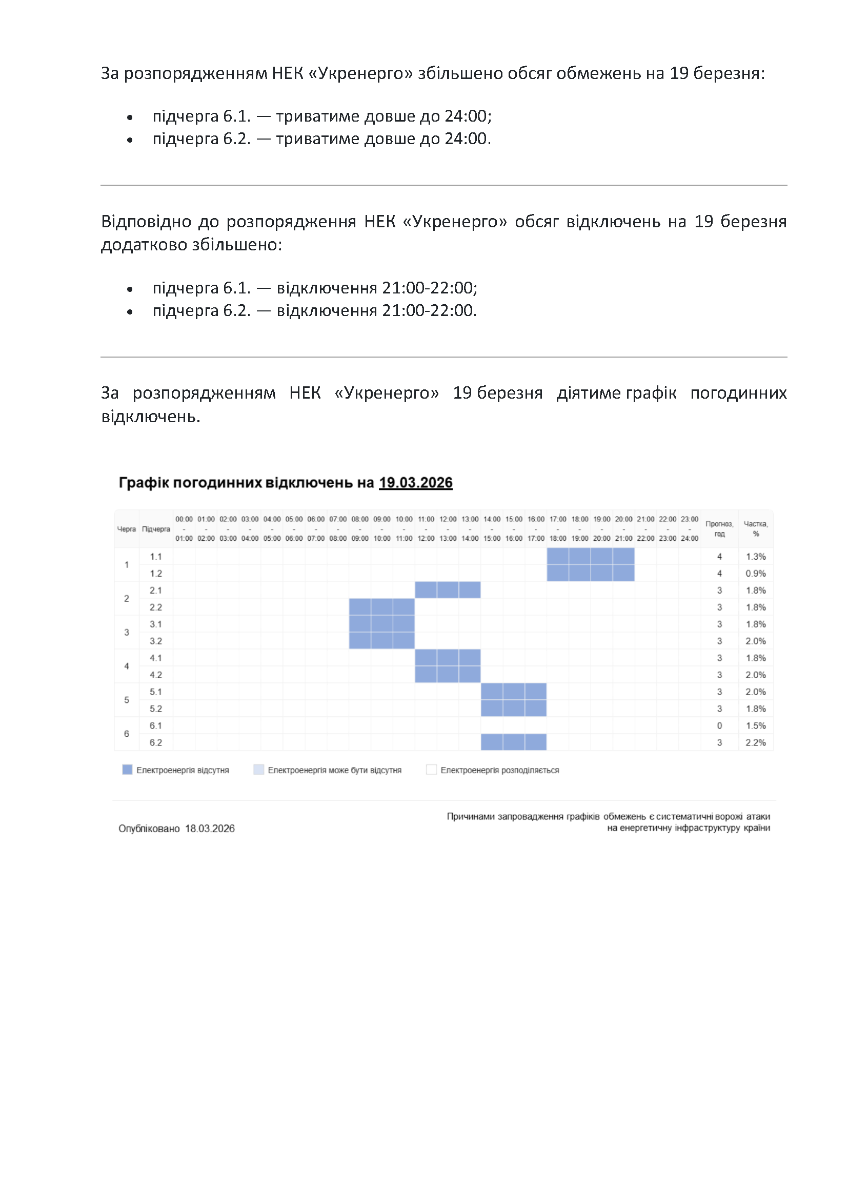 - Графік погодинних відключень 19.03.2026 (оновлення)
