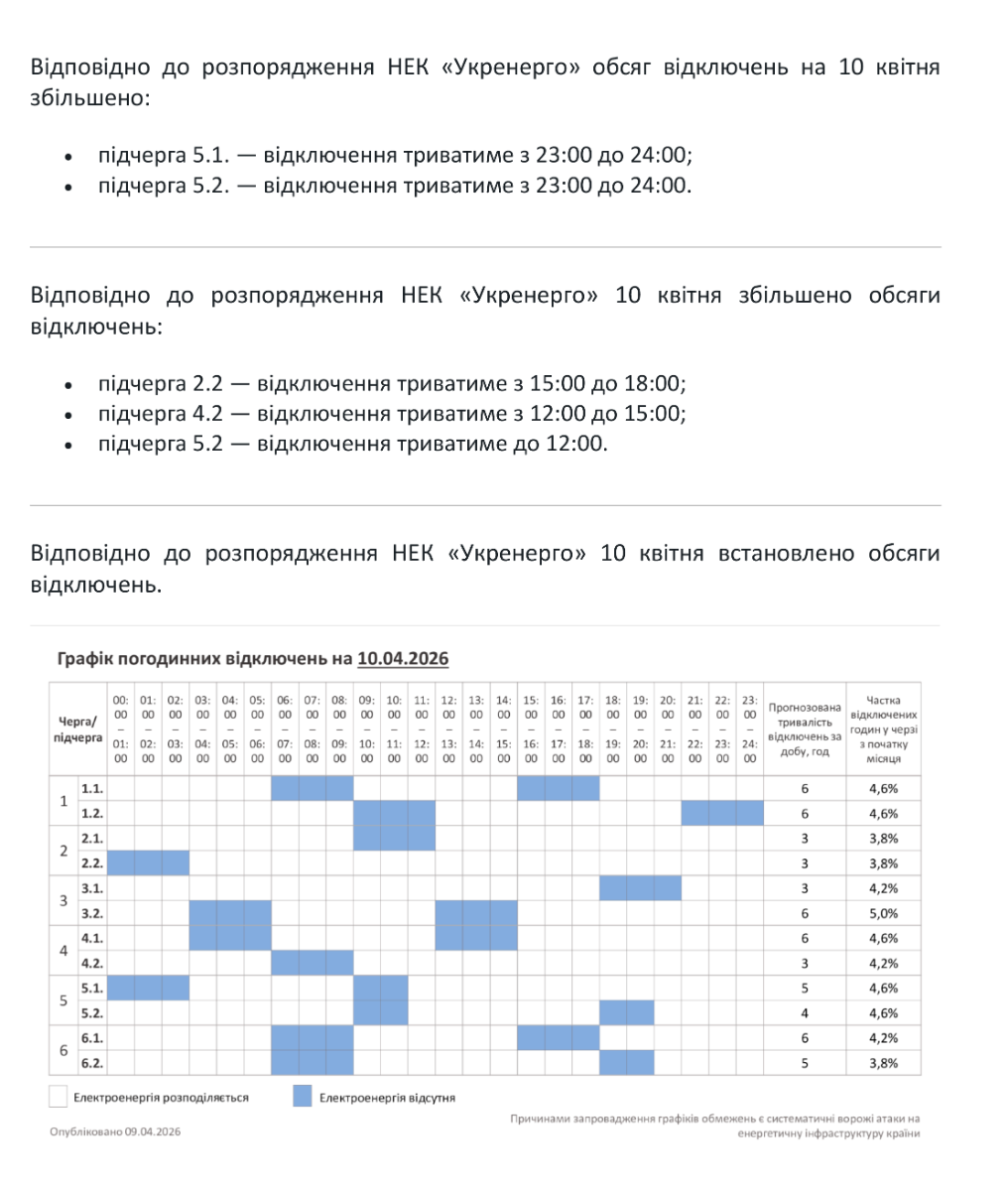 - Графік погодинних відключень 10.04.2026 (оновлення)